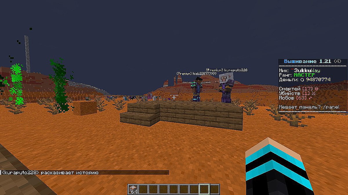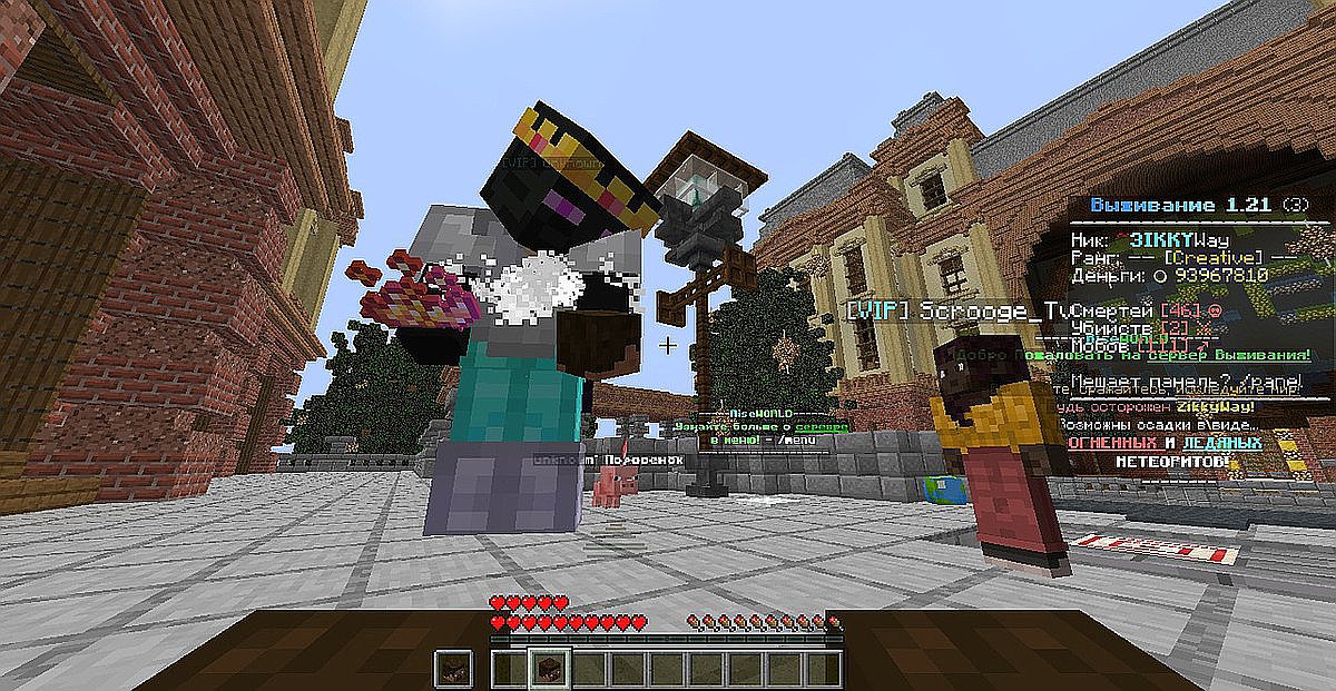Наш сервер стремится создать нескучное выживание с Кастомными Мобами, Мечами, генерацией и время от времени падающими метеоритами! И также, выживание дополняется Новыми чарами, Квестами, Аукционом, Ультра Гаджетами, Красивыми префиксами и многим другим!