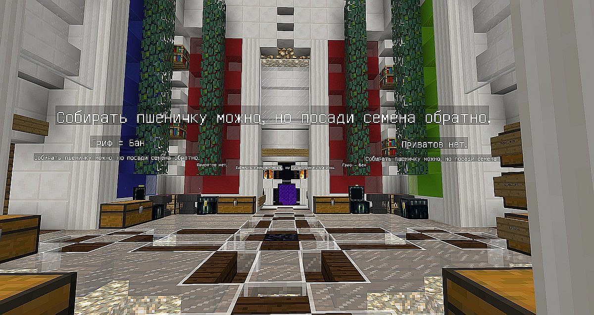 Сервер Minecraft без приватов, донатов, креатива и с мобами. Гриф - бан, все действия пользователя автоматически фиксируются и откатываются в считанные минуты, вредить бесполезно.